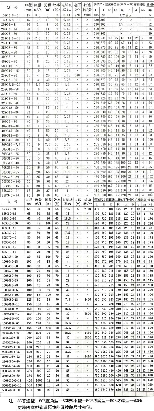 4.SGB系列防爆管道泵適用于輸送無腐蝕性液體,有甲烷或煤礦井下固定設備I類及工廠IIA、II B級,溫度組別為 T1、T2、T3、T4組存在爆炸性混合物的其它工業(yè)場所。使用溫度80℃以下。