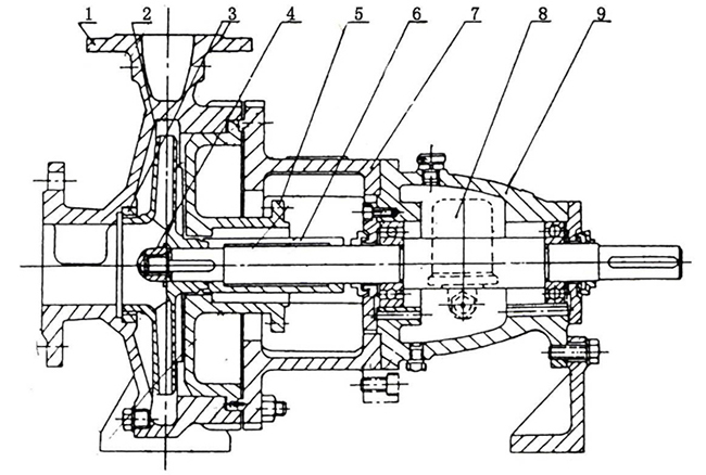 泵蓋通過止口固定在中間支架上,然后通過泵體與中間支架止口的聯(lián)接把泵蓋夾緊在中間,泵體是軸向吸入,徑向排出,腳支承式,可直接固定在底座上。懸架部件 通過止口固定固定在中間支架上,并用懸架支架支撐在底座上。為拆卸方便,設計了加長聯(lián)軸器,檢修時可以不拆卸進出口聯(lián)接管路,泵體和電動機。只需拆下聯(lián)軸 器的中間聯(lián)接件,即可退出轉(zhuǎn)子部件進行檢修。這是國際上通用的一種結構形式。